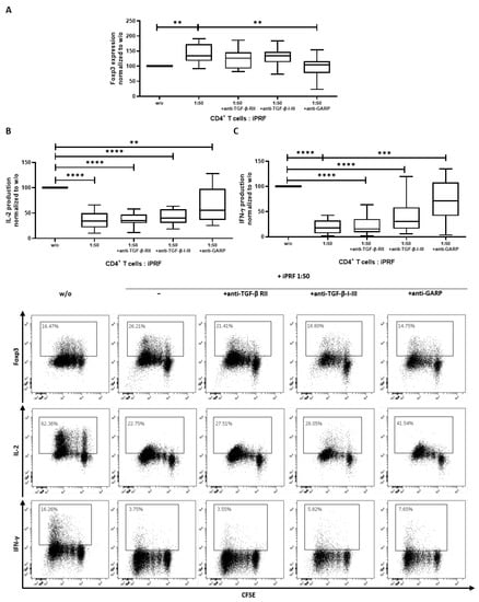 Liquid platelet rich fibrin (iPRF) induces a regulatory phenotype in CD4+ T cells. CD4+ T cells and iPRF were cocultured at a ratio of 1 to 50 and treated with either 10 µg/mL anti-TGF-ß receptor II (anti-TGF-β-RII) antibody (Ab), 10 µg/mL anti-TGF-β-1-III Ab, or 10 µg/mL anti-GARP Ab. CD4+ T cells were prelabled with carboxyfluorescein succinimidyl ester (CFSE) to track their proliferation and stimulated with 0.5 µg/mL anti-CD3 and 1.0 µg/mL anti-CD28 Abs in the presence or absence of iPRF. (A) The expression of Foxp3 was measured on day 3 of coincubation using intranuclear flow cytometry. (B,C) After 6 days of coincubation, cells were stimulated with phorbol 12-myristate 13-acetate (PMA), ionomycin, and monesin for 5 h. IL-2 and IFN-γ production was quantified via intracellular flow cytometry. Representative dot plots of 10 independent experiments are shown. Box plots show data which was normalized to the untreated CD4+ T cell control (n = 10, box and whiskers, medians ± min/max, ** p < 0.01, *** p < 0.001, and **** p ≤ 0.0001 determined by two-way ANOVA).