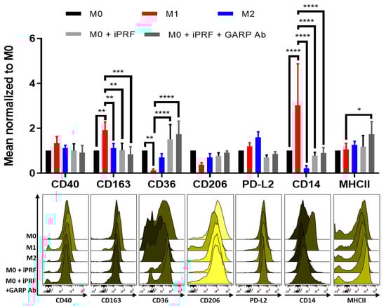 Liquid platelet rich fibrin (iPRF) polarizes M0-macrophages in a more “M0/M2-like” phenotype through a GARP independent mechanism. Human monocyte derived macrophages were polarized, treated with 400 µL iPRF/well, 10 μg/mL anti-GARP antibody (Ab) or were left untreated for 2 days as indicated. Surface marker expression was analyzed via flow cytometry. Bar diagram shows the mean fluorescence intensity (MFI) of each surface marker normalized to the respective M0 control. Representative histograms of 3 independent experiments are shown (n = 5 donors, bar means ± SD, * p < 0.05, ** p < 0.01, *** p < 0.001, and **** p < 0.0001 determined by two-way ANOVA).