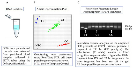 Genomic DNA from patients and controls was extracted and purified from peripheral blood samples collected in EDTA tubes using the Blood Mini genomic DNA kit (A&A Biotechnology, Gdynia, Poland) according to the manufacturer’s instructions and quantified by a UV-Vis spectrophotometer (Quawell Q3000, Quawell Technology Inc., San Jose, CA, USA). Analysis of the MTHFR C677T polymorphism was performed by polymerase chain reaction (PCR) followed by restriction digestion analysis. Amplification was performed using the forward primer, 5′-TGA AGG AGA AGG TGT CTG CGG GA-3′, and the reverse primer, 5′-AGG ACG GTG CGG TGA GAG TG-3′, which generate a fragment of 198 bp. Each PCR reaction of 25 μL involves 1U BIOTAQ™ polymerase (Bioline, Luckenwalde, Germany), 1× PCR buffer (10× NH4 Reaction Buffer), 1.5 mM magnesium chloride solution (50 mM MgCl2), 400 µM dNTP (Thermo Scientific™, Waltham, MA, USA) and 0.4 pmol of each primer. Samples were amplified using the following PCR conditions: 5 min of initial denaturation at 94 °C, followed by 35 cycles of 94 °C for 30 s, 60 °C for 30 s, and 72 °C for 30 s, with a final extension at 72 °C for 3 min. The amplified PCR product was digested with HinfI restriction enzymes (Thermo Scientific™, Waltham, MA, USA). The digestion reactions contained 20 μL of PCR product, 2.5 μL of R buffer (supplied with enzyme), 0.5 μL of restriction enzyme, and 2 μL of nuclease-free water. Restriction analysis was performed for 4 h at 37 °C. The digestion products were analyzed by electrophoresis on ethidium bromide-stained 2.5% agarose gel and visualized under UV light (ChemiDoc MP, Bio-Rad, Hercules, CA, USA). The digestion fragment sizes were a single 198 bp band for the 677 CC genotype; 198 bp, 175 bp and 23 bp for 677 CT; and 175 bp and 23 bp for 677 TT. The genotypes were tested twice, and genotyping was 100% concordant. A second genotyping was performed using a pre-validated TaqMan Assay designed by Life Technologies (Assay ID:C___1202883_20; SNP ID:rs1801133). The experimental schemes are shown in Figure 1. Probes were labeled with VIC and FAM fluorochromes to identify the homozygotes and heterozygotes. Reactions were conducted in 96-well plates with a total volume of 12 μL. We used 2 ng of genomic DNA, TaqMan Genotyping Master Mix 1× (Life Technologies) and TaqMan Genotyping Assay 1×. PCR cycling conditions were 95 °C for 10 min, 40 cycles of 95 °C for 15 s, and 60 °C for 1 min. After amplification, the fluorescence data were captured using a ViiA7 Real-Time PCR System (Applied Biosystems, Life Technologies, Waltham, MA, USA).