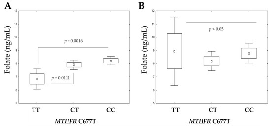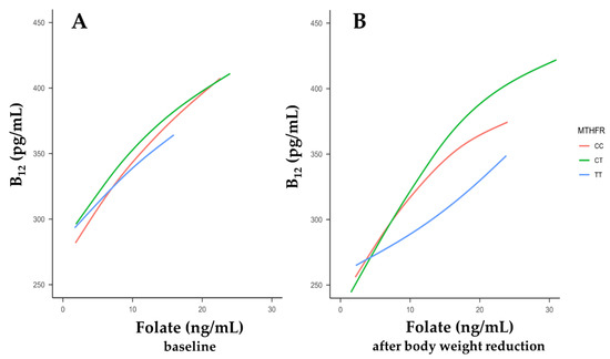 Both folates and vitamin B12 have a crucial role in the maintenance of one-carbon metabolism and are responsible for many of the reactions and processes in the human body. Vitamin B12 enables proper and effective folate utilization. A statistically significant positive correlation between the folate and vitamin B12 concentrations was seen in patients with the MTHFR CC and CT genotypes (p < 0.05). This was true for both the baseline visit (Figure 3A) and the visit after body-weight reduction (Figure 3B) and can be explained by the mutual participation of folate and vitamin B12 in metabolic pathways.