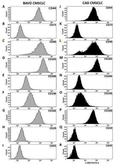 The immunophenotype of CMSCLC derived from BAVD and CAD tissues was determined by profiling a panel of cell surface antigens established as being positively or negatively expressed by MSC. CMSCLC were immunolabelled using antibodies to CD44, CD73, CD90, CD105, CD106, CD146, CD166, CD45 and CD19 and used in combination with flow cytometry [36]. Analysis of the data generated revealed that both cell populations expressed markers normally expressed by MSCs and CMSCLCs, and were negative for expression of CD45 and CD19 (Figure 2).
