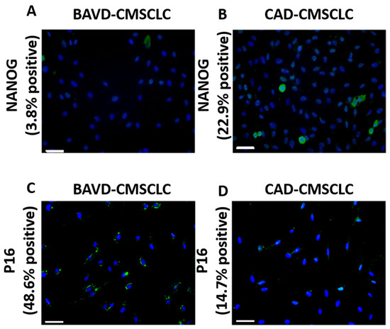 Immunolabelling of CMSCLC for NANOG and p16. (A,B) ICC analysis for NANOG expression in BAVD-CMSCLC and CAD-CMSCLC. NANOG (Green), all nuclei labelled with Dapi (Blue). (C,D) ICC analysis for p16 expression in BAVD-CMSCLC and CAD-CMSCLC. p16 (Green), all nuclei labelled with DAPI (Blue). Scale bar = 50μm.