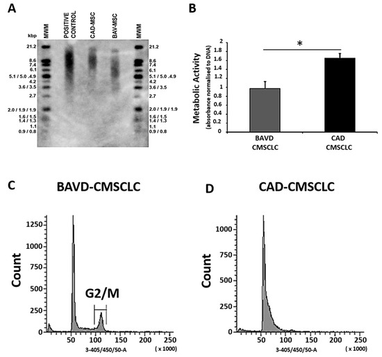 Evaluation of CMSCLC senescent phenotype (A) Measurement of CMSCLC telomere length. (A) TeloTAGGG Telomere Length Assay was used to measure telomere length of BAVD-CMSCLC and CAD-CMSCLC. Resolved telomere fragments from Hinf I/Rsa I-digested control gDNA, CAD-CMSCLC gDNA and BAV-CMSCLC gDNA were hybridized with DIG-labelled telomere-specific probe, incubated with anti-DIG antibody conjugated to alkaline phosphatase and visualized by chemiluminescence. Average telomere fragment lengths were calibrated against a DIG-labelled molecular weight marker (MWM). (B) Measurement of metabolic activity. Measurement of metabolic activity as an indicator of cell health was performed on CMSCLC using an alamarBlue® assay, the fluorescence of the resulting culture media was normalized against total DNA content. * = p < 0.05 of n = 3 independent technical replicates, Mann–Whitney test. (C,D) Cell cycle analysis. Results of flow cytometry analysis for cell cycle of BAVD-CMSCLC, note the presence of a subpopulation of cells in the G2/M phase that is absent in the CAD-MSCs.