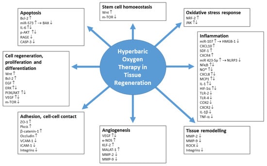 The effects of HBO on tissue regeneration have been studied extensively, both in experimental and clinical settings. By addressing the mechanisms involved in transcription, signaling, stress reaction, apoptosis and cell-death, cellular structure and cell-to-cell contacts, adhesion, migration as well as inflammation, HBO upregulates processes involved in repair while mechanisms perpetuating tissue damage are downregulated []. Though a large variety of HBO-induced changes on the molecular level have been described, there are still unresolved aspects in the mechanisms of HBO-induced tissue repair, some of them with specific impacts for well-determined types of tissues or injuries.