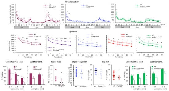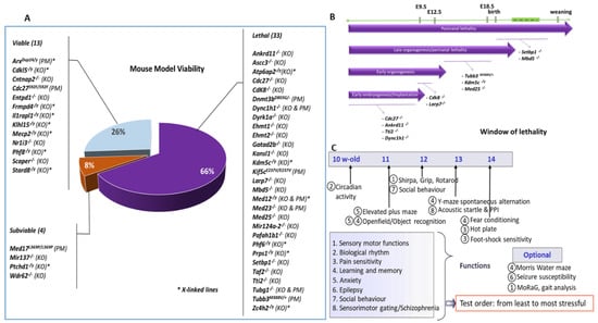 Different types of strategies were followed for generating the appropriate models (see Section 2 and Figure S1). Subsequently, we assessed the viability of the mutant mouse lines. Twenty-seven lines were further investigated using a standardized behavioural screen, focusing on males since a wide range of disorders associated with ID are X-linked ID and 33% of genes in the present study are located on the X-chromosome. Several tests were used to assess a wide range of functions or their pathologies, including circadian activity, neurological reflexes and specific motor abilities, anxiety-related behaviour, sensorimotor gating, and learning and memory processes. For some mouse lines, additional tests were performed to further characterize abnormalities observed or to extend phenotypic traits related to individual genes.