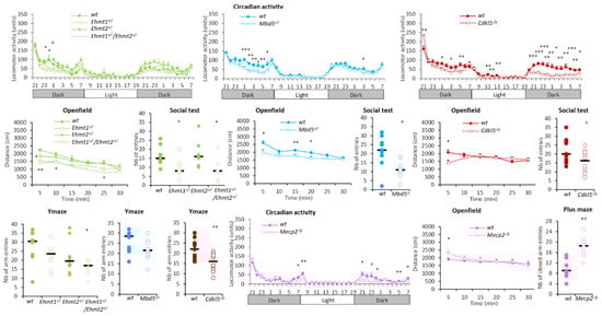 Hypoactivity group. Ehmt1+/−, Ehmt1+/−/Ehmt2+/−, Mbd5+/− and Cdkl5−/y showed decreased activity in the circadian activity, in the open field, in social recognition and in the Y-maze tests, reflected by lower number of beam breaks, reduced distance, and lower number of visits or arm entries, respectively, as compared to wild-type counterparts. Mecp2−/y showed decreased locomotion in circadian activity and increased closed arm entries in the elevated plus maze. Data are expressed as the mean ± SEM of front and back beam breaks (circadian activity) distance (open field) across time, or as scattergrams with the median for the number of entries (social, Y-maze, plus maze tests) and analysed using repeated measures ANOVA, followed by a t-test for each time point. * p < 0.05, ** p < 0.01, *** p < 0.001 vs. WT.