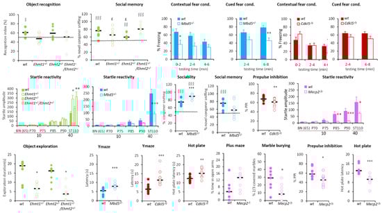 Selected behavioural alterations in the hypoactivity group. Ehmt1+/−, Ehmt1+/−/Ehmt2+/−, Mbd5+/− showed altered memory performance in the fear conditioning (decreased % of freezing), object recognition (recognition index) or social tests (% novel congener sniffing). Mbd5+/− and Mecp2−/y had decreased startle while Ehmt1+/−, Ehmt1+/−/Ehmt2+/− had improved startle. Ehmt1+/−, Ehmt1+/−/Ehmt2+/−, Mbd5+/− and Cdkl5−/y showed increased anxiety in the open field (decreased object exploration) or in the Y-maze (increased latency). Mecp2 mutants show decreased anxiety in marble burying (decreased number of marbles covered) and in the plus maze (increased %time in the open arms) and decreased pain threshold. Data are mean ± SEM (fear conditioning, startle reactivity) or scattergrams with the median (object recognition, social test, Y-maze, marble burying, hot plate). Data are analysed using either repeated measures ANOVA followed by t-tests or Student’s t-test for single time points. * p < 0.05, ** p < 0.01, *** p < 0.001 vs. WT; § p < 0.05, §§ p < 0.01, §§§ p < 0.001 vs. the chance level; £ vs. Ehmt1+/−/Ehmt2+/−.