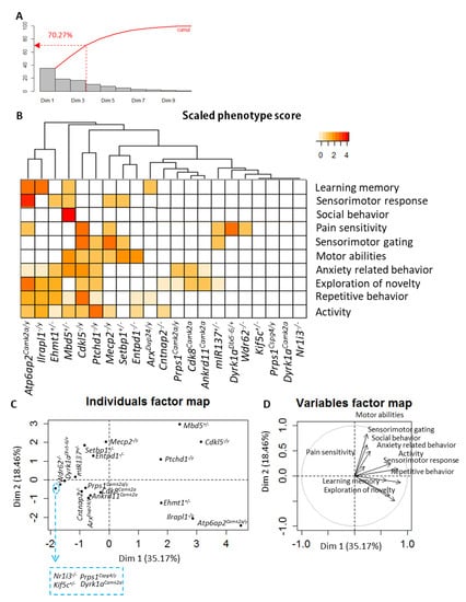 The first observation of Figure 5B shows a group of mutant lines, including Atp6ap2Camk2a/y, Il1rapl1−/y, Ehmt1+/−, Mbd5+/−, Cdkl5−/y, and Ptchd1−/y, with a high number of functional alterations. The second cluster includes gene mutations with a moderate number of altered functions, and includes Mecp2−/y, Setbp1+/−, Entpd1−/−, miR137+/−, Dyrk1aDlx5−6/+, Wdr62−/−, Prps1Camk2a/y, Cdk8Camk2a, Ankrd11Camk2a, ArxDup24/y, and Cntnap2−/−. The last group of mutants displayed a few changes or no phenotype. PCA was performed to visualise potential links between biological functions and mutant line similarities (Figure 5C,D and Supplementary Materials). On the one hand, a group of lines including Cdkl5−/y, Il1rapl1−/y, Ptchd1−/y, Atp6ap2Camk2a/y, Mbd5+/−, and Ehmt1+/− displayed alterations mainly in activity, repetitive behaviour, novelty exploration and anxiety (Axis 1). On the other hand, mutant lines including Cdk8Camk2a, Mecp2−/y and Setbp1+/− showed deficits in motor abilities and pain sensitivity, while Atp6ap2Camk2a/y and Ilrapl1−/y showed learning and memory deficits.