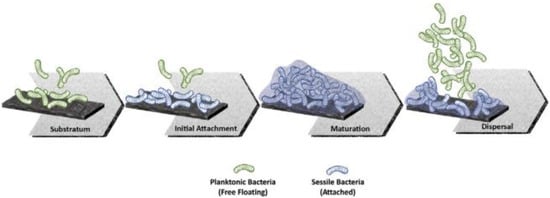 Nevertheless, it has been found that osteopromotion is not the only biological process taking advantage of the micro and nano features present on modified Ti surfaces. In effect, the rough surfaces create an environment that is also favorable to bacterial adherence and biofilm formation [30,31,32]. In addition, it is now known that early microbial colonization depends on a number of other factors, such as the surface potential and wettability [33,34]. A scheme of the complex multi-step process that leads to biofilm formation on solid surfaces is shown in Figure 1.
