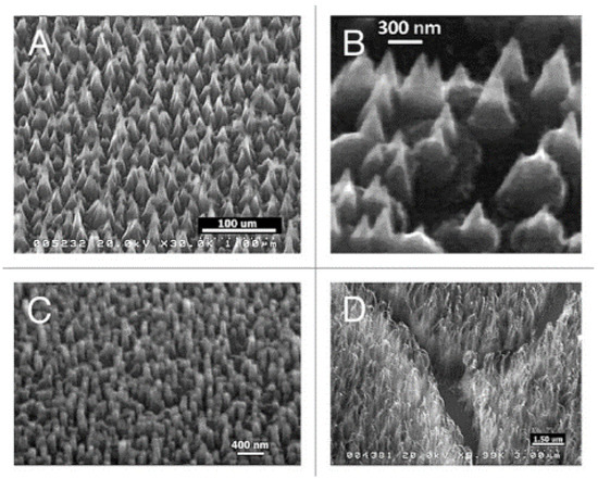SEM images of diamond nanocones (A,B), nanopillars (C) and nanowhiskers (D), produced by the sculpturing of plane diamond films by means of a MW-RF CVD plasma reactor (From Ref. [102]).