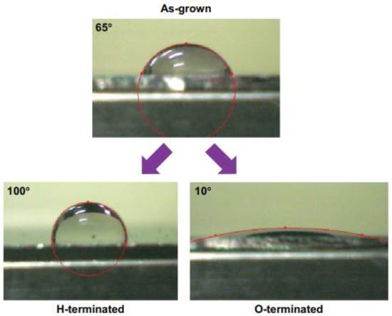 Wetting properties of diamond films as grown and treated in hydrogen plasma (H-terminated) or oxygen plasma (O-terminated) (From Ref. [105]).