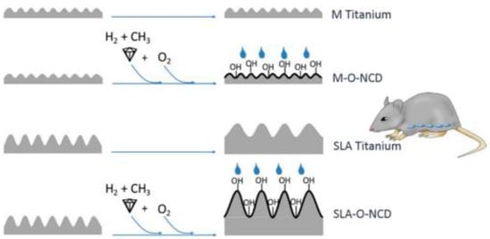 - Stigler, R.G.; Becker, K.; Bruschi, M.; Steinmüller-Nethl, D.; Gassner, R. Impact of Nano-Crystalline Diamond Enhanced Hydrophilicity on Cell Proliferation on Machined and SLA Titanium Surfaces: An In-Vivo Study in Rodents. Nanomaterials 2018, 8, 524. [Google Scholar] [CrossRef] [PubMed]