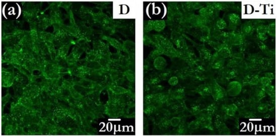 Confocal microscopy images of MG 63 cells grown for 4 days on undoped diamond D (a) and on Ti-doped D-Ti (b) samples (Adapted from Ref. [117]).