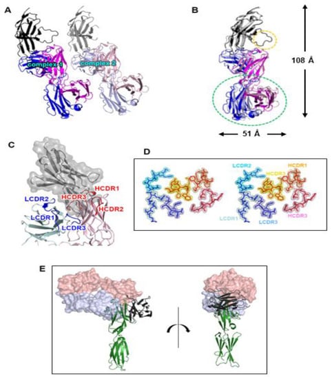The ectodomain of PD-1 was expressed as inclusion bodies in E. coli, and its soluble form was produced using a refolding procedure. A cemiplimab Fab fragment was expressed in the periplasm of E. coli. The 1:1 complex of PD-1 and cemiplimab Fab was present in the solution as a monomer, according to size exclusion chromatography (Supplementary Figure S1). The crystal structure of PD-1 in complex with the Fab fragment of cemiplimab was determined with a resolution of 1.98 Å and R/Rfree of 0.187/0.235. The crystal’s space group is P1, and an asymmetric unit contains two copies of the complex with a pseudo-translational symmetric relationship (Figure 1A). Superposition of the structures of PD-1 from the two copies in an asymmetric unit showed that the PD-1 protein and all the six complementarity determining regions (CDRs) of cemiplimab displayed minimal structural differences from one another, with clear electron density on almost all of the complex’s residues (Figure 1B,D). One copy of the complex had a somewhat disordered PD-1 C’D loop, implying that its contribution to cemiplimab binding was likely to be minor (Figure 1B). Due to the inherent flexibility of the elbow region within an antibody, the constant region of the bound Fab was slightly skewed (Figure 1B). Cemiplimab’s PD-1 binding was mediated by five complementarity determining regions (CDRs), leaving LCDR2 uninvolved (Figure 1C). When the complex structure of PD-1 and cemiplimab was overlaid onto the complex structure of PD-1 and PD-L1 with the shared fixed PD-1 (Figure 1E), the underlying mechanism by which cemiplimab blocks the PD-1 from the binding of PD-L1 became clear. The variable region of cemiplimab’s light chain sterically collided with PD-L1 prior to establishing the PD-1/PD-L1 complex when cemiplimab binds to PD-1.