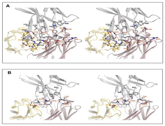 Detailed interactions within the PD-1/cemiplimab interface. (A) Stereoscopic view of the interactions, including hydrogen bonds, ionic interactions, and van der Waals contacts between PD-1 and cemiplimab. (B) Stereoscopic view of the water-mediated hydrogen bonds. PD-1, heavy, and light chains of cemiplimab are colored gray, pale red, and pale yellow, respectively. Hydrogen bonds and ionic interactions are depicted as dotted lines.
