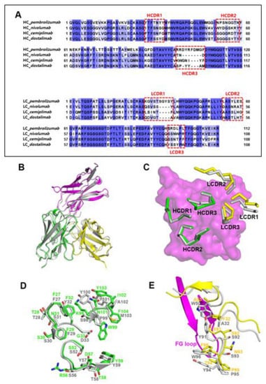 Crystal structures of the FDA-approved antibodies in complex with the ectodomain of PD-1 have revealed the molecular details of their PD-1 blockade mechanism [20,21,22,23,24,25,26,27]. While nivolumab predominantly binds to the PD-1’s flexible N-terminal region, pembrolizumab primarily binds to the C’D loop [18,19,20,21]. The binding of dostarlimab to PD-1 involves the interaction with the flexible BC, C’D and FG loops within PD-1 [24]. Although PD-1 does not involve these flexible loop regions for its ligand binding, these antibodies efficiently hinder the ligand–receptor interaction by steric blocking through the interactions with these loops [25]. With a resolution of 3.40 Å, the crystal structure of PD-1 in complex with the single-chain variable fragment (scFv) of cemiplimab was just recently described, giving the structural basis for PD-1 blockade by cemiplimab [26]. Here, we present the crystal structure of human PD-1 in complex with the Fab fragment of cemiplimab at a resolution of 1.98 Å, revealing a more precise binding mechanism and epitope. A detailed analysis of the PD-1 binding of these FDA-approved antibodies enriches our understanding of the molecular basis of anti-PD-1 therapeutics for developing improved biologics and effective combination therapies for treating cancer.