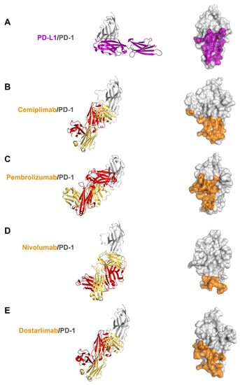 Comparison of PD-1 binding by PD-L1 and antibodies. (A) Structure of the extracellular domain of PD-1 (gray) in complex with the extracellular PD-L1 (purple) and the PD-L1 binding site (purple) on the surface of PD-1. (B) Structure of the extracellular domain of PD-1 in complex with the cemiplimab Fab and its epitope region on the surface of PD-1. (C) Structure of the extracellular domain of PD-1 in complex with the pembrolizumab Fab and its epitope region on the surface of PD-1. (D) Structure of the extracellular domain of PD-1 in complex with the nivolumab Fab and its epitope region on the surface of PD-1. (E) Structure of the extracellular domain of PD-1 in complex with the dostarlimab Fab and its epitope region on the surface of PD-1. In (A–E), PD-1 is displayed in the same orientation, and the heavy and light chains of the antibodies and their epitope regions are colored red, yellow, and orange, respectively.