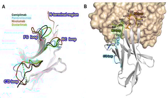 Previous studies have reported the complex structures of PD-1 with the FDA-approved antibodies, nivolumab, pembrolizumab, and dostarlimab, describing the structural basis of PD-1 blockades by antibody drugs [20,21,22,23,24]. The molecular mechanism underlying the clinical efficacy of the PD-1 antibodies can be better understood by comparing the binding interactions of PD-1 with PD-L1 and the antibodies in extensive detail. The antibodies and PD-L1 bind to the immunoglobulin-like extracellular domain of PD-1 from various directions and on distinct binding sites when the PD-1 structures extracted from the complex structures with PD-L1, cemiplimab, pembrolizumab nivolumab, and dostarlimab were superimposed (Figure 4). The binding of PD-1 to PD-L1 is mediated by the interaction involving the residues within the front β-sheet of the ectodomain of PD-1, while the antibody drugs predominantly interact with the loop regions of PD-1 protein [23,29]. Although the area of the binding interface between PD-1 and PD-L1 is comparable to the interfaces of antibody-binding, the antibody drugs bind to PD-1 with considerably increased binding affinity than PD-L1, implying the loop regions would be hotspots on PD-1 for effective interaction between PD-1 and the antibody drugs. Although there is no head-to-head comparison of the antibodies’ effect in vitro, the binding affinities (Kd) of the antibodies to PD-1 vary; 27 pM for pembrolizumab, 4.06 nM for nivolumab, 0.6 nM for cemiplimab, and 0.3 nM for dostarlimab [17,19,21,22].The loops of the PD-1 ectodomain adopt distinct structures when they engage to various binding partners, such as PD-L1 and the antibody drugs, implying that they are intrinsically flexible and their optimal conformations are induced to increase binding affinity (Figure 5). The binding of nivolumab is largely dependent on its ability to interact with the N-terminal region of PD-1, whereas pembrolizumab and dostarlimab bind primarily to the C’D loop of distinct conformation [20,21,22,23,24]. The nivolumab-bound form of PD-1 was the only crystal structure in which the N-terminal extension of PD-1 was visible, suggesting its inherent flexibility. The C’D loop encroaches upon a groove created by the paratope of pembrolizumab, and the majority of the loop’s residues participates in the interaction with the drug. The C’D loop would also be the primary contributor to the dostarlimab-binding of PD-1 because the residue R86 in the C’D loop of PD-1 occupies a concavity within the paratope of dostarlimab through hydrogen bonds, ionic interactions, and pi–cation interactions. Additionally, the BC and FG loops of PD-1 also undergo conformational changes upon binding to these antibodies, providing extra interactions with them [20,24]. Additionally, these loops’ specific conformations are incompatible with PD-L1 binding because they participate in the PD-L1 interaction in distinct conformations. Even though cemiplimab and dostarlimab similarly bind to PD-1, the differences in the specific interaction mentioned above caused the loops’ conformation to vary for the best interaction with the two antibodies. The binding of cemiplimab to PD-1 also involves the interaction with the flexible BC, C’D, and FG loops of PD-1. Given that the PD-1 residue E61 is thought to play a significant role in the interaction with cemiplimab through a salt bridge and multiple hydrogen bonds, the BC loop of PD-1 would be the dominant hotspot for binding cemiplimab.