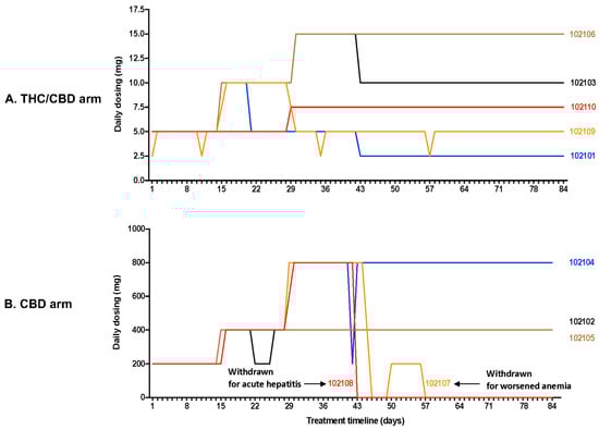 Daily dosage of CBD-only and THC/CBD combination during the 12 weeks of treatment. (A) THC/CBD arm: In arm 1 (THC/CBD), two participants were able to reach the maximum daily dose of the study drugs (15 mg THC/15 mg CBD), but only one remained at this dose until the end of the treatment, the other participant reduced his dosing to 10 mg THC/10 mg CBD per day because of the occurrence of AEs (somnolence). Two other participants from arm 1 reached the daily dose 10 mg THC/10 mg CBD, but after 3 weeks of treatment, they reduced their dosing because of the occurrence of AEs, one participant experienced cognitive impairment (#102109), while the other had somnolence, fatigue, difficulty concentrating, nightmares and paranoid thoughts (#102101). One remained at 5 mg THC/5 mg CBD per day and the other one who had multiple AEs reduced his daily dose to 2.5 mg THC/2.5 mg CBD after 5 weeks of treatment. A participant (#102110) from arm 1 who first reduced his daily dosing from 5 mg THC/5 mg CBD after 3 weeks of treatment to 2.5 mg THC:2.5 mg CBD, finally increased his dosing from 2.5 mg THC/2.5 mg CBD per day to reach 7.5 mg THC/7.5 mg CBD per day until the end of treatment. (B) CBD arm: 3 participants reached the maximum daily dose of 800 mg CBD after 4 weeks of treatment, but two of them experienced AEs (transient transaminitis for #102107) and SAE (hepatitis with persistent elevated transaminases and worsened diabetes type 2, for #102108) and the treatment was permanently discontinued 1 and 2 weeks after, and they were withdrawn from the study. The other participant who reached the maximum daily dose of 800 mg remained on this daily dose until the end of the study. Finally, two participants from arm 2 gradually increased their daily dosing to reach dose of 400 mg of CBD per day and remained in this range until the end of the study medication.