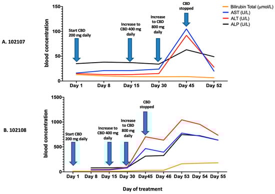 Dynamics of liver enzymes of participant #102107 and #102108 from arm 2 (TN-C200M2: CBD only), during cannabinoid uptake. Evolution of liver enzyme blood levels in (A). participant #102107 and (B). participant #102108 during the up-titration of CBD dose from the starting of CBD medication to the cessation of the treatment.