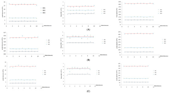 The results of the analysis of the assigned value at the concurrency levels of hematological reference samples run on the ABX Micros 60 (A), Celldyn 1700 (B) and Mindray BC 2000 (C). The three lines represent the mean (assigned value) for the low, normal, and high concentrations, respectively, and 10 points represent the results of 10 laboratories.