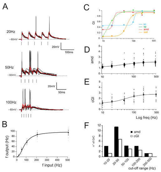 In the same experiments, repetitive stimulation at different frequencies was adopted to assess gain-frequency dependencies (Figure 2A). Neuronal gain modulation was hence evaluated as the input–output relationship of the firing frequencies [2] for cells responding with repetitive firing (Figure 2A,B). The resulting curves showed sigmoidal shapes with cutoff frequencies between 20 and 100 Hz (Figure 2C, average cutoff (78 ± 15 Hz; n = 16 cells Figure 2B). In the presence of active Golgi cell inhibition [61,62], GrCs tend to generate either sub-threshold responses or a limited number of spikes. In order to account for cells showing subthreshold responses, gain-frequency curves were generated for a series of parameters related to both EPSPs (average maximum depolarization, amd; Figure 2C) and spike properties (spike count, sc; spike probability, sp; 1st spike SD, ssd) (Figure 2C; Materials and Methods and [63]). A cumulative compound gain index (cGI, Figure 2D) was then generated by summing the normalized parameters for each of the recorded cells (Methods). The probability of observing a given cutoff frequency was evaluated using amd for EPSPs cells and cGI for the spiking cells. Average amd and cGI curves (Figure 2D,E) were fitted with sigmoidal functions (cGI: A1 = 1.03 ± 0.23, A2 = 2.69 ± 0.17, fc = 43.2 ± 13.7 Hz, p(χ2) = 0.03, n = 14; amd: A1 = 1.18 ± 0.05, A2 = 2.0 ± 0.06, fc = 77.7 ± 10.9 Hz, p(χ2) = 0.01, n = 24). The analysis of cells behavior showed that most of the cells displayed a cutoff frequency in the range between 20 and 50 Hz (amd, 45.8% out of n = 24 cells; cGI, 50% out of n = 14 cells; Figure 2F); however, all single granule cells showed high-pass filtering properties with sigmoidal responses reflecting nonlinearity in EPSP temporal summation and spike generation. Interestingly, the ensemble behavior of amd and cGI displayed a frequency dependence similar to that observed with imaging ensemble recordings [10,23], indicating that high-pass filtering network properties could be traced down to synaptic and cellular mechanisms.