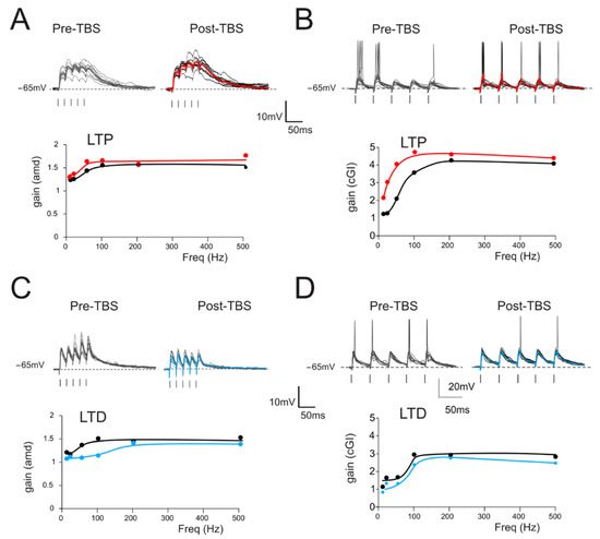 Gain modulation by synaptic plasticity (A) Top. Traces (10 repetitions) obtained from a GrC showing subthreshold responses to repetitive stimulation at 50 Hz in the control (left) and following the delivery of TBS (right). Average traces (thick, gray and red) show that, in this cell, TBS increased the average response, as expected from the expression of LTP. Bottom. Gain curve of the cell shown in the top traces before (black) and after LTP (red) induction. (B) Top. In a different cell, there was repetitive stimulation at 20 Hz (10 traces) obtained from a GrC showing firing responses to repetitive stimulation in the control (left) and following the delivery of TBS (right). Average traces (thick, gray and red) show that, in this cell, TBS increased the number of spikes and decreased the spike delay and variability. Bottom. Gain curve of the cell showed in the top traces before (black) and after LTP (red) induction. (C) Top. Traces (10 repetitions) obtained from a GrC showing subthreshold responses to repetitive stimulation at 50 Hz in the control (left) and following the delivery of TBS (right). Average traces (thick, gray and blue) show that, in this cell, TBS decreased the average response, as expected from the expression of LTD. Bottom. Gain curve of the cell shown in the top traces before (black) and after LTP (blue) induction. (D) Top. In a different cell, there was repetitive stimulation at 20 Hz (10 traces) obtained from a GrC showing firing responses to repetitive stimulation in the control (left) and following the delivery of TBS (right). Average traces (thick, gray and blue) show that, in this cell, TBS decreased the number of spikes and increased the spike delay and variability. Bottom. Gain curve of the cell shown in the top traces before (black) and after LTP (blue) induction.