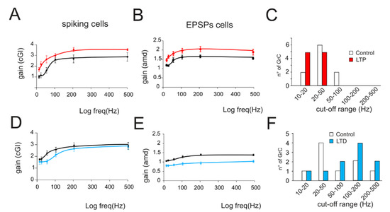 Average gain modulation. (A) Average change in cGI obtained from cells showing LTP. (B) Average change in the amd index obtained from cells showing LTP. (C) Histogram shows the number of cells showing a particular cutoff frequency in the control (white bars) and following the expression of LTP (red bars). Note the increase in low-frequency cells in response to LTP. (D) Average change in cGI obtained from cells showing LTD. (E) Average change in the amd index obtained from cells showing LTD. (F) Histogram shows the number of cells showing a particular cutoff frequency in the control (white bars) and following the expression of LTD (blue bars). Note the increase in low-frequency cells in response to LTD.