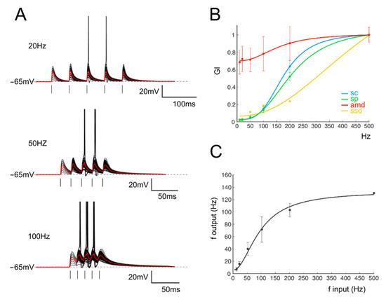 (A) Voltage traces show the membrane potential changes of a single GrC model stimulated with burst pulses at different frequencies. The simulated microcircuit is composed of two mfs and two GoCs. Ten traces are superimposed, and the average response is in red. (B) Gain index (GI) for the four parameters accounting for EPSPs (amd) and spike properties (sc, sp and ssd) obtained from the model of a single GrC. (C) The I/O relationship in single GrCs between the stimulation and response frequencies (n = 100 repetitions). An average thick line is obtained with a sigmoidal fitting (Equation (1)) on average responses for each frequency (black circle).
