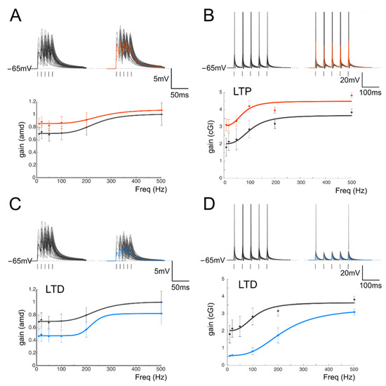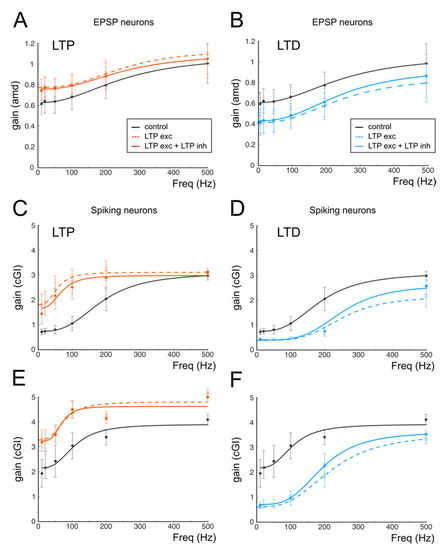 The signal processing in neuronal circuits requires the dynamic regulation of synaptic responses. The sensitivity to input transformation is in turn modulated by integrating a wide series of mechanisms such as background noise integration [1,2], short-term synaptic plasticity [3] or shunting inhibition [4]. Moreover, additional mechanisms persistently altering the balance between synaptic inputs can actively regulate the neuronal input–output relationship. In this scenario, long-term synaptic plasticity [5,6,7,8] has been shown to modulate neuronal sensitivity to input transformation, leading to alterations in the input–output transfer function. Persistent changes in synaptic efficiency induced by LTP and LTD are expected to change transmission parameters such as spike-timing [9] or frequency range dependency [10]. LTP and LTD are thought to provide an elementary mechanism for learning and memory [11,12]. In general, a change in synaptic weight is expected to modify the activation of circuit elements implementing complex functions [13,14]. Moreover, self-organization and other computational effects are expected to emerge from the topological organization of excitatory and inhibitory connections (e.g., Kohonen layer, Hopfield recurrent networks, Sejinowsky Boolean operators [15,16,17]). However, these theoretical models assume that LTP and LTD are just “synaptic weight” changes and omit any details on the way LTP and LTD could dynamically control spike processing in local circuits [18]. In principle, LTP and LTD should be able to affect the timing, number and frequency of spikes emitted in response to incoming spike bursts. Even more, by modifying mechanisms sensitive to the incoming burst patterns (such as the NMDA current or neurotransmitter release dynamics), LTP and LTD could regulate the gain and frequency dependence of signal transmission.