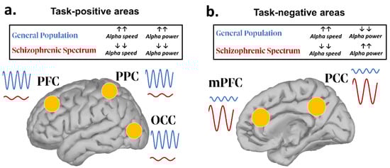 Graphical representation summarizing the main findings on resting-state alpha power in SSD (relative to healthy individuals). The left panel (a) depicts alpha oscillatory patterns relative to task-positive areas, while the right panel (b) depicts those relative to task-negative regions (largely overlapping with DMN’s nodes). Upward and downward arrows indicate respectively an increase or a decrease in alpha power or frequency speed. As for the former areas, alpha power is decreased, while the latter show an overall increase of such oscillatory index. PFC (prefrontal cortex); PPC (posterior parietal cortex); OCC (occipital cortex); mPFC (medial prefrontal cortex); PCC (posterior cingulate cortex).