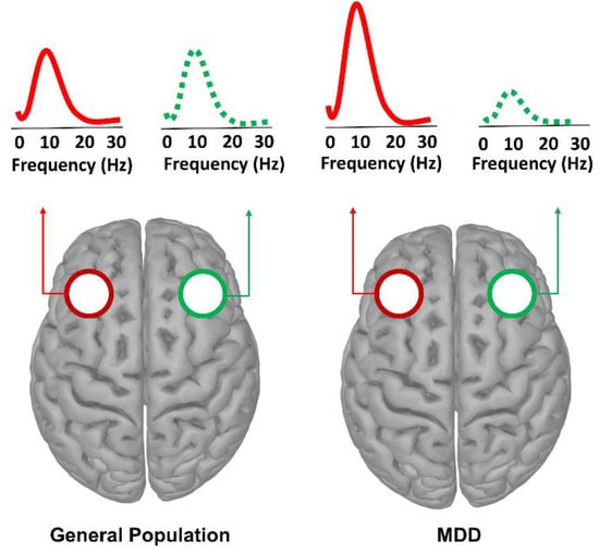 Oscillatory insights into the pathophysiological dynamics underlying MDD suggest that individuals diagnosed with this disorder exhibit rhythmic aberrations, encompassing lower frequency bands, which is likely due to alterations occurring at cortical and subcortical loops that coalesce into a neuropathological phenotype known as thalamocortical dysrhythmia [64,118,119]. Consistent with this notion, MDD patients display higher alpha power levels over the left (relative to the right) frontal lobe, an oscillatory pattern called frontal alpha asymmetry (FAA; Figure 2) [120]. Given the inverse relationship between alpha rhythms and cortical excitability, this electrophysiological abnormality has been framed within the approach–withdrawal model [121], where an increased activation of the right vs. left frontal cortices has been thought to occur in individuals more prone to behavioral withdrawal vs. approach (i.e., proneness toward a negative vs. positive affective style). As such, FAA has been deemed as one of the most reliable biomarkers (although for a different account, see [122,123,124]) indexing MDD-related affective asymmetries responsible for symptoms such as hopelessness or helplessness and anhedonia [118,120,125].