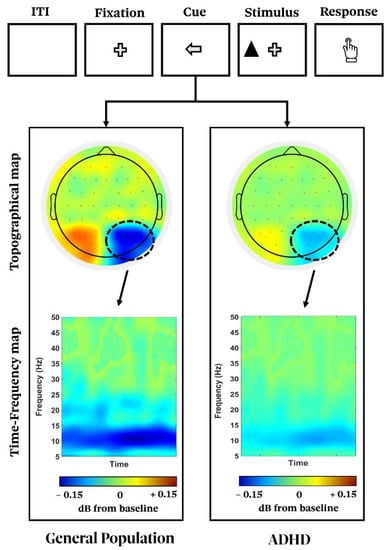 EEG analyses have played a pivotal role in the exploration of ADHD oscillatory biomarkers [43,46,47]. Although some findings might appear to be controversial due to the heterogeneity of ADHD phenotypes, existing literature suggests that individuals diagnosed with ADHD exhibit several alterations in oscillatory mechanisms crucial for cognition (see for instance [236]). Mid-frontal theta [237] and motoric beta alterations are often reported [238,239] together with impairments involving posterior alpha rhythms. In particular, it has been observed that the anticipation of visual distractors is linked to an alpha activity decrease over the visual cortex in typically developing individuals, whereas the anticipation of relevant stimuli increases it [30,49]. Moreover, an increase in the alpha power has been reported over relevant regions during high-demanding cognitive tasks, which is thought to suppress external inputs in order to support the relevant ones [49].