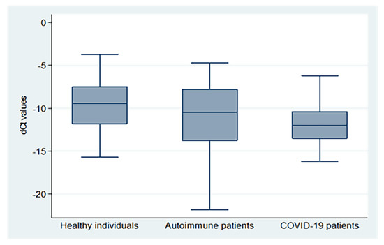 | Healthy Individuals | Autoimmune Patients | COVID-19 Patients | F | p | |||||