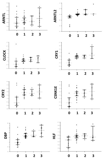 Distributions of gene expression in both controls and affected patients for ARNTL, ARNTL2, CLOCK, CRY1, CRY2, CSNK1E, DBP, and HLF. The central line corresponds to the median, upper, and lower bars to the IQR. For the X axis label, 0 corresponds to controls, 1 to AIP, 2 to HCP, and 3 to CEP and PCT.