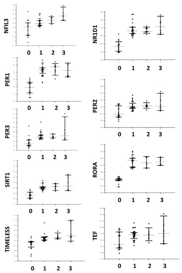 Distributions of gene expression in both controls and affected patients for NFIL3, NR1D1, PER1, PER2, PER3, RORA, SIRT1, TEF, and TIMELESS. The central line corresponds to the median, upper, and lower bars to the IQR. For the X axis label, 0 corresponds to controls, 1 to AIP, 2 to HCP, and 3 to CEP and PCT.