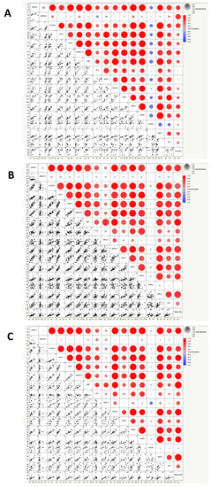 Correlation matrices showing correlation values between the expression of circadian genes in controls (A), grouped patients affected by porphyrias (B), symptomatic patients affected by porphyrias (C). The heat maps show the correlation coefficients, which measure the degree of the linear relationship between each pair of variables. The correlation values can fall between −1 and +1. Positive correlation is measured on a 0.1 to 1.0 scale. The range from 0.1 to 0.3 indicates weak positive correlation, the range from 0.3 to 0.5 indicates a moderate positive correlation, and the range from 0.5 to 1.0 indicates a strong positive correlation. Bubble size represents statistical significance expressed as −Log “p-value” (log-rank test), where the larger the size, the greater the significance.