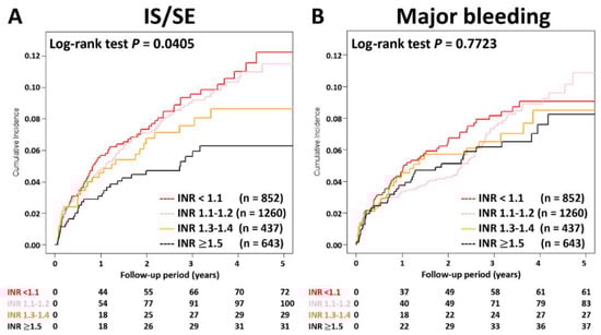 The cumulative incidence curves of thromboembolic and bleeding events in patients with different INR categories are shown in Figure 3. Thromboembolic events appeared to be lower in patients with an INR ≥ 1.5 compared to other groups (p = 0.04), while the risk of major bleeding was not significantly different between four groups (p = 0.77). Supplementary Table S1 and Figure 4 show the adjusted hazard ratios (aHRs) and 95% confidential intervals (CIs) of IS/SE and major bleeding of patients with different INRs compared to those with an INR < 1.1. Patients with an INR ≥ 1.5 were associated with a lower risk of IS/SE than those with an INR < 1.1 (aHR: 0.57; [95%CI: 0.37–0.87]; p < 0.01). The risk of major bleeding was comparable between patients with an INR ≥ 1.5 and those with an INR < 1.1. The risk of IS/SE and major bleeding did not differ significantly between patients with an INR < 1.1, 1.1~1.2, and 1.3–1.4.