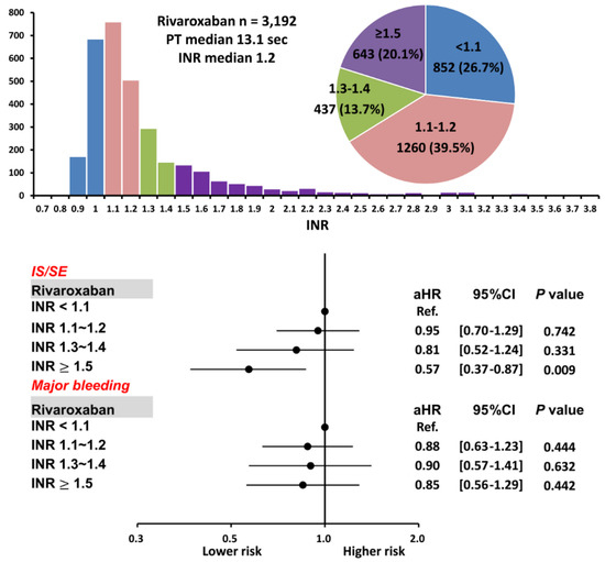 Risks of IS/SE and major bleeding for 3192 AF patients treated with rivaroxaban with different INR. Among 3192 patients treated with rivaroxaban, there were 643 (20.1%) patients having an INR ≥ 1.5. Compared to patients with an INR < 1.1, patients with an INR ≥ 1.5 were associated with a lower risk of IS/SE and were not associated with a higher risk of major bleeding. aHR = adjusted hazard ratio; CI = confidential interval; INR = international normalized ratio; IS/SE = ischemic stroke/systemic embolism; PT = prothrombin time.