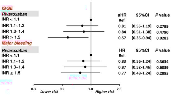 Risks of IS/SE and major bleeding for 3192 AF patients treated with on-label dosing of rivaroxaban with different INR levels. Among 2203 patients treated with rivaroxaban, compared to patients with an INR < 1.1, patients with an INR ≥ 1.5 were associated with a lower risk of IS/SE and were not associated with a higher risk of major bleeding. aHR = adjusted hazard ratio; CI = confidential interval; INR = international normalized ratio; IS/SE = ischemic stroke/systemic embolism; PT = prothrombin time.
