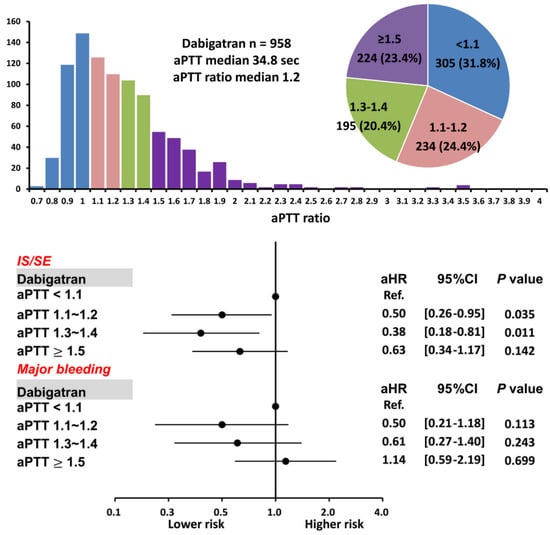 Patients with an aPTT ratio of 1.1–1.2 and 1.3–1.4 were associated with a lower risk of IS/SE than those with an aPTT ratio < 1.1 after dabigatran (aHR: 0.50; [95%CI: 0.26–0.95]; p = 0.04 for an aPTT ratio of 1.1–1.2 vs. < 1.1; aHR: 0.38; [95%CI 0.18–0.81]; p = 0.01 for aPTT ratio of 1.3–1.4 vs. < 1.1), while patients with an aPTT ratio ≥1.5 showed a comparable risk of IS/SE to those with an aPTT ratio <1.1. The risk of major bleeding was comparable between patients with a different aPTT ratio (Supplementary Table S3 and Figure 6). Logistic regression analysis did not demonstrate any factors significantly associated with an elevated aPTT ratio for patients treated with dabigatran.