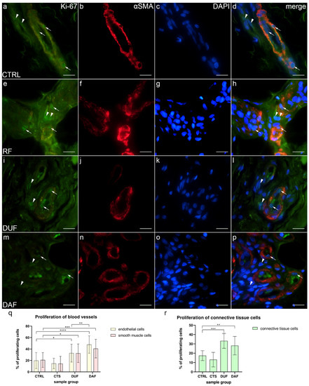 Co-expression of Ki-67 and α-SMA in connective tissues of patients with CTS and DD. CTRL–palmar fascia of CTS patients (a–d); RF–flexor retinaculum of CTS patients (e–h); DUF–clinically unaffected palmar fascia of DD patients (i–l); DAF–clinically affected palmar fascia of DD patients (m–p). Nuclear Ki-67 expression (a,d,e,h,i,l,m,p) is seen in blood vessels (arrows) and surrounding connective tissue cells (arrowheads); α-SMA staining shows sections through blood vessels (b,f,j,n). DAPI staining displays all cell nuclei (c,g,k,o). Double immunofluorescence staining to Ki-67, α-SMA, and DAPI, 1000× magnification, scale bar 50 µm. Statistically significant differences in proliferation rate are displayed by graphs for both blood vessels (q) and connective tissue cells (r). Error bars show standard deviation; * p < 0.05, ** p < 0.01, *** p < 0.001, **** p < 0.001.
