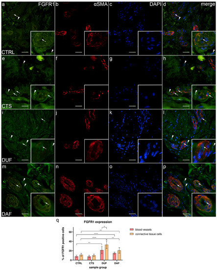 Co-expression of FGFR1 and α-SMA in connective tissues of patients with CTS and DD. CTRL–palmar fascia of CTS patients (a–d); RF–flexor retinaculum of CTS patients (e–h); DUF–clinically unaffected palmar fascia of DD patients (i–l); DAF–clinically affected palmar fascia of DD patients (m–p). FGFR1 expression (a,d,e,h,i,l,m,p) is seen in blood vessels (arrows) and surrounding connective tissue cells (arrowheads); α-SMA staining shows sections through blood vessels (b,f,j,n). DAPI staining displays all cell nuclei (c,g,k,o). Insets (a–p) reveal the distribution of FGFR1 staining in blood vessels. Double immunofluorescence staining to FGFR1, α-SMA, and DAPI, 400× magnification, scale bar 100 µm. The graph displays statistically significant differences in FGFR1 expression of blood vessel and connective tissue cells (q). Error bars show standard deviation; * p < 0.05, ** p < 0.01, **** p < 0.001.