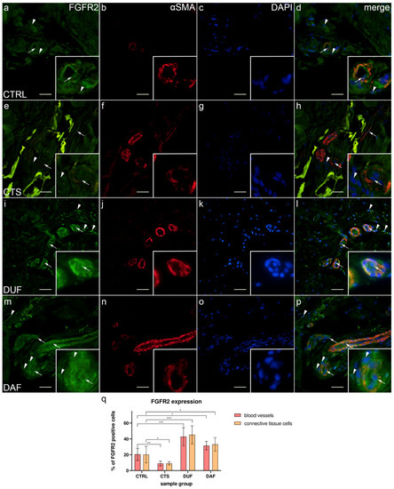 Co-expression of FGFR2 and α-SMA in connective tissues of patients with CTS and DD. CTRL–palmar fascia of CTS patients (a–d); RF–flexor retinaculum of CTS patients (e–h); DUF–clinically unaffected palmar fascia of DD patients (i–l); DAF–clinically affected palmar fascia of DD patients (m–p). FGFR2 expression (a,d,e,h,i,l,m,p) is seen in blood vessels (arrows) and surrounding connective tissue cells (arrowheads); α-SMA staining shows sections through blood vessels (b,f,j,n). DAPI staining displays all cell nuclei (c,g,k,o). Insets (a–p) reveal the distribution of FGFR2 staining in blood vessels. Double immunofluorescence staining to FGFR2, α-SMA, and DAPI, 400× magnification, scale bar 100 µm. The graph displays statistically significant differences in FGFR2 expression of blood vessel and connective tissue cells (q). Error bars show standard deviation; * p < 0.05, ** p < 0.01, *** p < 0.001.