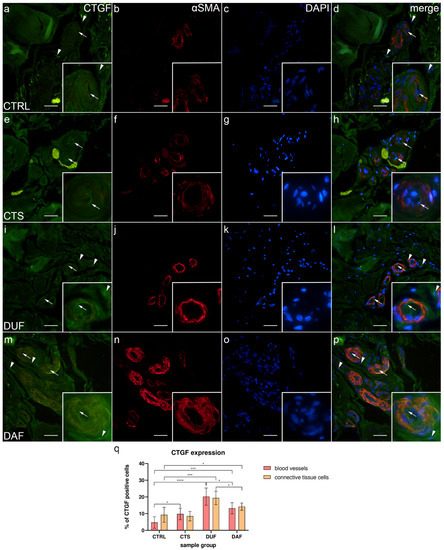 Co-expression of CTGF and α-SMA in connective tissues of patients with CTS and DD. CTRL–palmar fascia of CTS patients (a–d); RF–flexor retinaculum of CTS patients (e–h); DUF–clinically unaffected palmar fascia of DD patients (i–l); DAF–clinically affected palmar fascia of DD patients (m–p). CTGF expression (a,d,e,h,i,l,m,p) is seen in blood vessels (arrows) and surrounding connective tissue cells (arrowheads); α-SMA staining shows sections through blood vessels (b,f,j,n). DAPI staining displays all cell nuclei (c,g,k,o). Insets (a–p) reveal the distribution of CTGF staining in blood vessels. Double immunofluorescence staining to CTGF, α-SMA, and DAPI, 400× magnification, scale bar 100 µm. The graph displays statistically significant differences in CTGF expression of blood vessel and connective tissue cells (q). Error bars show standard deviation; * p < 0.05, *** p < 0.001, **** p < 0.001.