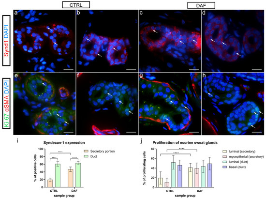 Expression of syndecan-1 and co-expression of Ki-67 and α-SMA in eccrine sweat glands of healthy controls and patients with DD. CTRL–normal skin of healthy individuals (a,b,e,f); DAF–clinically affected palmar fascia of DD patients (c,d,g,h). Syndecan-1 expression is seen in eccrine sweat gland cells (arrows) of secretory portions (a,c) and ducts (b,d). Nuclear Ki-67 expression is also seen in eccrine sweat gland cells (arrows) of secretory portions (e,g) and ducts (f,h); α-SMA staining shows myoepithelial cells of sweat gland secretory portions and sections through surrounding blood vessels (e–h). DAPI staining displays all cell nuclei (a–h). Immunofluorescence staining to syndecan-1 and DAPI, and double immunofluorescence staining to Ki-67, α-SMA, and DAPI, 1000× magnification, scale bar 50 µm. Statistically significant differences in syndecan-1 expression (i) and proliferation rate (j) are displayed by graphs. Error bars show standard deviation; **** p < 0.001.