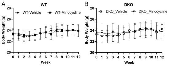 The body weight of wild type (WT, (A)) and double knockout (DKO, (B)) mice in vehicle or minocycline treated mice during the 3 months study.