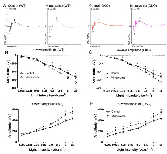 The effect of minocycline on visual function measured by electroretinography (ERG). (A) Representative images of scotopic ERG from vehicle-treated or minocycline-treated wild type (WT) and double knockout (DKO) mice. (B,C) a-wave amplitude of vehicle- and minocycline-treated WT (B) and DKO (D) mice. (D,E) b-wave amplitude of vehicle- and minocycline-treated WT (B) and DKO (D) mice. Mean ± SEM, n ≥ 8 mice (16 eyes), * p < 0.05, ** p < 0.01 compared to the same light intensity of vehicle-treated mice by 2-way ANOVA with Sidak’s multiple comparison test.