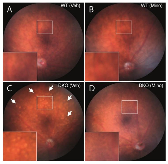 Fundus images of vehicle- or minocycline-treated wild-type (WT) and double knockout (DKO) mice. Fundus images were taken from 9-month-old WT (A,B) or DKO (C,D) mice following 3 months vehicle (A,C) or minocycline (B,D) treatment. High-magnification images of rectangle areas were shown in the lower left corner of each image. Arrows—whitish dots. Veh—vehicle; Mino—minocycline.