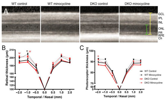 The effect of minocycline on retinal thickness. (A) Representative SD-OCT images from vehicle- or minocycline-treated wild type (WT) and double knockout (DKO) mice. Yellow line showing the measurement of the overall retinal neuronal thickness, the green line showing the measurement of outer retina (photoreceptor layer, including ONL and PR) thickness. (B,C) Graphs showing the overall retinal neuronal thickness (B) and photoreceptor layer thickness (C) at the positions of 0.5, 1 and 2 mm away from the optic disc at temporal and nasal sites. Mean ± SEM, n ≥ 8 mice (16 eyes), * p < 0.05 between minocycline-treated and vehicle-treated WT mice at the same location, ψ p < 0.05 between minocycline-treated and vehicle-treated DKO mice at the same location. 2-way ANOVA with Sidak’s multiple comparison test. GCL: ganglion cell layer; IPL: inner plexiform layer; INL: inner nuclear layer; ONL: outer nuclear layer; PR: photoreceptor segments; RPE: retinal pigment epithelia; Ch: choroid; WT: Wild type; DKO: double knockout.